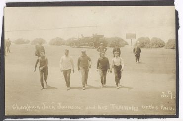 This is an original Type I photo of Jack Johnson at Gus Wilson's Training camp in at Orangebourough New Jersey. The United Internation Press Photois stamped on the back. 8 x 10 inches #0762